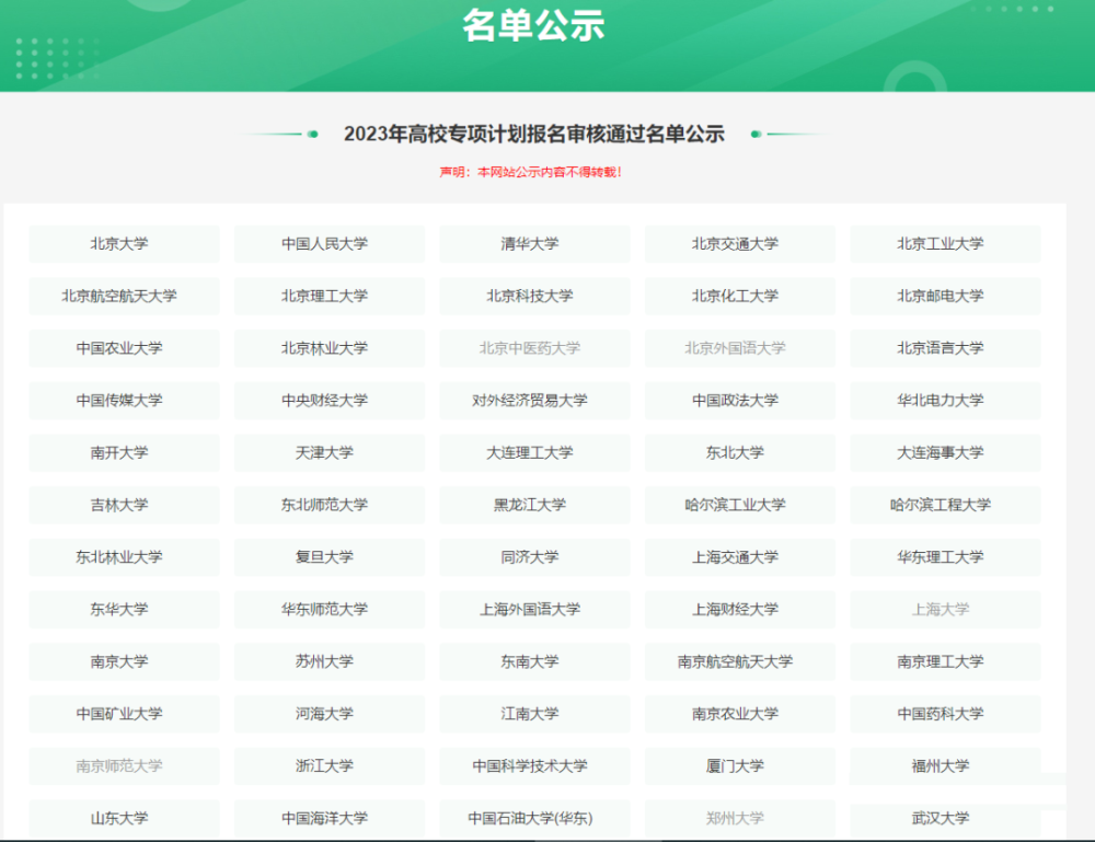 高校专项计划,又叫做“农村学生单独招生”,是国家为更好地促进教育公平、让更多的农村学生上大学而出台的一项优惠政策,主要招收边远、原贫困、民族等地区县(含县级市)以下高中勤奋好学、成绩优良的农村学生,具体实施区域由有关省(区、市)确定。