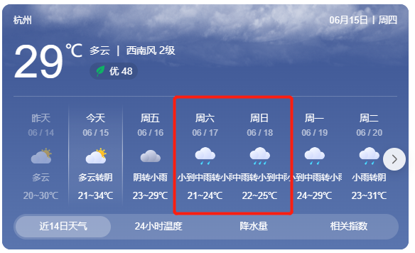 根据天气预报,周末两天为降雨天气,易出现强降雨过程,请注意提前安排好出行时间,注意交通安全。