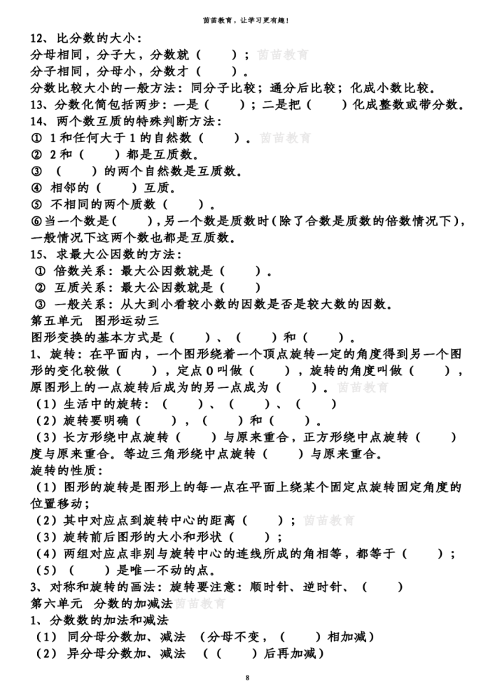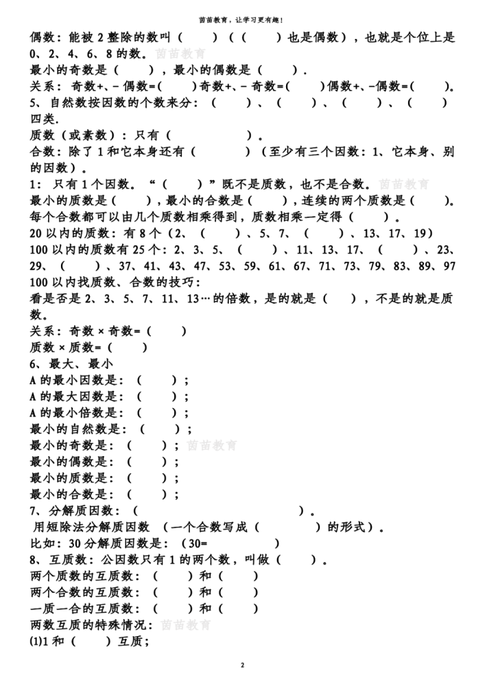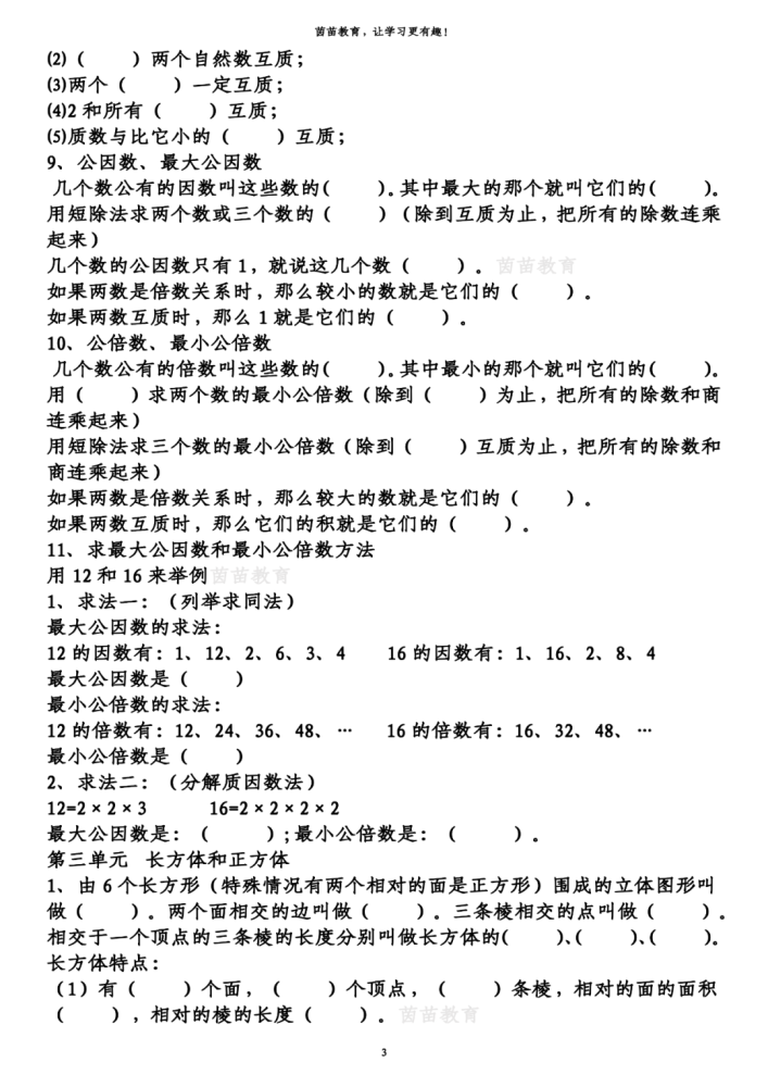 8、互质数:公因数只有1的两个数,叫做互质数。