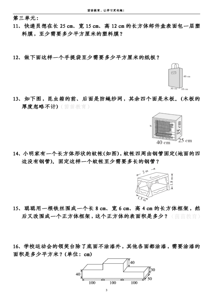 16、前、后:[100×40+100×(40+30)+100×30]×2=28000(cm2)
