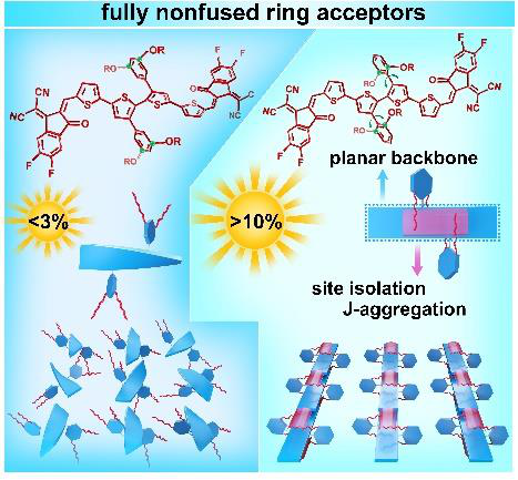 自Y6受体分子问世,其高效率成功吸引众多业内工作者,因此也开始“Y系列”受体分子的改进与修饰,目前基于“Y系列”受体分子的最高效率接近18%,熔融环受体分子的设计佳作频出,但完全非熔融环受体分子的发展却略显缓慢,因此,北京师范大学薄志山课题组设计并合成了2种完全非熔融环受体o-4TBC-2F和m-4TBC-2F,通过调节己基氧基链的位置控制分子扭曲程度,以此影响分子聚集体的形成,以PBDB-T为给体,基于o-4TBC-2F共混膜具有高电荷迁移率、低能量损失和高PCE值(10.26%),远高于m-4TBC-2F(2.63%),是目前报道基于完全非熔融环受体PCE值最高的器件之一,为全非熔融环受体的发展再次打通一条新的方向!相关成果以“A De Novo Design of Fully Non-fused Ring Acceptor with Planar Backbone and Near-IR Absorption for High Performance Polymer Solar Cells”为题于2020年8月31日发表于《Angew》