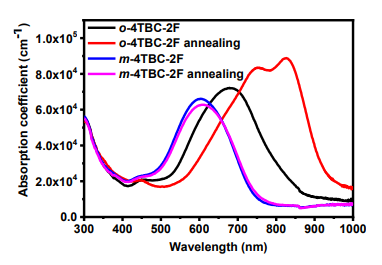 如图1是2个分子的结构,可以发现受体分子具有如下潜在优势:[1]平面主链有利于π-电子离域;[2]平面分子促进分子间π-π相互作用,进而促进电荷运输;[3]侧链垂直取代防止分子过度聚集;[4]4个侧链为受体提供良好的溶解性,从而使得共混膜具有良好形貌。更重要的是,在热退火之后,o-4TBC-2F分子诱导产生J-聚集,最近的相关研究表明,J-聚集和其他类型的分子间相互作用有助于构建3D网络结构,使得电荷空穴传输途径增加,传输效率得以提升。