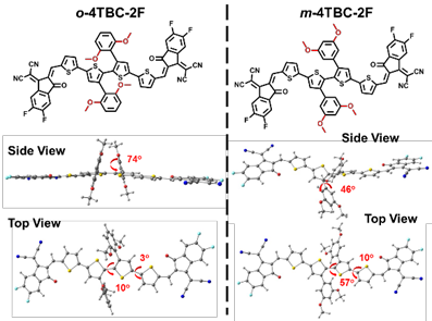 图3 DFT计算分子几何构型。从侧面看,o-4TBC-2F分子主链是平面状态,而m-4TBC-2F分子主链扭曲,由于烷氧基位置不同,与主链的二面角分别为74°、46°;俯视图观察2个中心噻吩单元的二面角分别为10°、57°,非取代噻吩和侧链取代噻吩的二面角分别为3°、10°