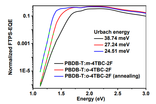 图4 归一化FTPS-EQE光谱。PBDB-T:o-4TBC-2F和PBDB-T:m4TBC-2F的EUs分别为27.24和38.74meV,PBDB-T:o-4TBC-2F共混膜的EU降低了24.51meV,表明PBDB-T:o-4TBC-2非辐射能连损耗较低,有助于Jsc与Voc之间的平衡
