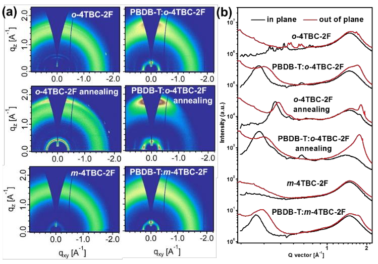 图5 纯膜与共混膜GIWAXS测量。纯o-4TBC-2F和m-4TBC-2F薄膜采用随机的分子取向,无可见(010)和(100)衍射峰;热退火后,纯o-4TBC-2F薄膜出现(010)和(100)衍射峰,表明热退火可以进一步促进o-4TBC-2F的分子堆积行为;对于共混膜,PBDB-T:m-4TBC-2F具有非晶态特征,在OOP方向出现微弱(010)峰,而PBDB-T:o-4TBC-2F共混物表现出更好的结晶特性,π-π相互作用更强;热退火后,PBDB-T:o-4TBC-2F共混膜的二维衍射特征明显,一维谱图出现明显(010)峰,表明PBDB-T:o-4TBC-2F共混膜具有明显的长程有序性和择优取向面,有助于电荷输运