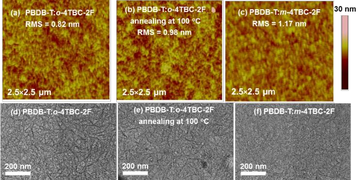 图6 PBDB-T:o-4TBC-2F和PBDB-T:m-4TBC-2F共混膜的AFM和TEM图像。PBDB-T:m-4TBC-2F薄膜形成均匀的表面形貌,相比之下,PBDB-T:o-4TBC-2F薄膜中形成了具有微小纤维的纳米级相分电影先生离,热退火后这种现象更加明显;TEM中,PBDB-T:o-4TBC-2F薄膜具有清晰的互穿网络结构,有助于激子离解和电荷传输,而PBDB-T:m-4TBC-2F薄膜,无法观察到纳米纤维
