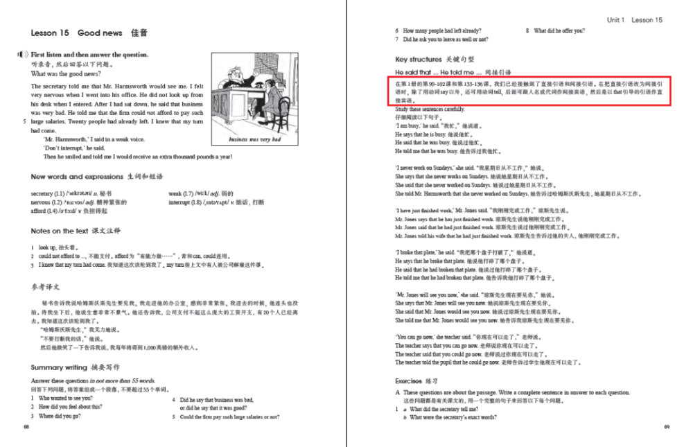 比如一册L99-102和L133-136接触了直接引语和间接引语,但没有讲二者的关联。到了二册L15,系统讲解了如何将直接引语改为间接引语。