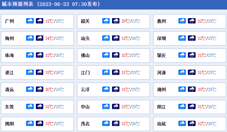 23日—24日,西部市县有大到暴雨局部大暴雨;25日,韶关、清远、肇庆和粤西市县多云有大雨局部暴雨或大暴雨。雷雨时伴有短时强降水、强雷电和分散8级左右雷暴大风等强对流天气。