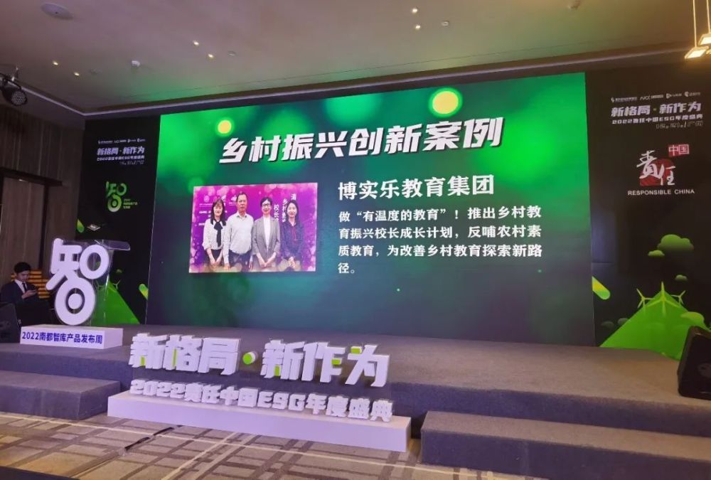 教育“扶智”,坚守初心。2022 年12月21日下午,在南方都市报2022 责任中国 ESG 年度盛典上,由碧桂园集团、国强公益基金会主办,博实乐教育集团参与的“乡村教育振兴校长成长计划”获评企业社会责任优秀案例!
