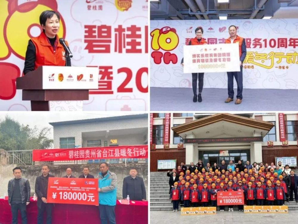 情暖寒冬,爱暖人心。2021年12月,博实乐携手碧桂园集团乡村振兴办公室、国强公益基金会、碧桂园志愿者协会,共同启动了“暖冬行动”,先后开展了“茁壮成长计划”、公益集市、“以废代捐”等公益活动。博实乐通过发起“茁壮成长计划”,向贵州雷山县第三小学和台江县台盘乡空寨村小学捐赠了3万元体育物资,并联动其所运营服务的8所学校,捐赠约3.3万件校服,总价值超100万元,为学生们送去温暖,抵御寒冬。