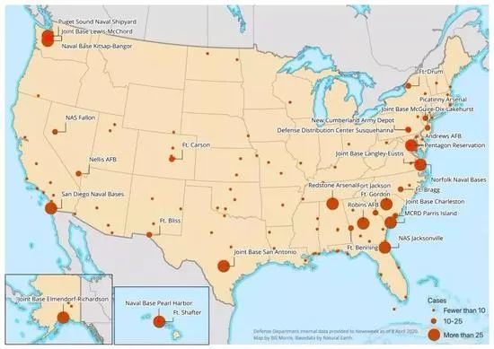《新闻周刊》公布了“美军疫情地图”,图中标注了100多个出现确诊病例的美军基地及各基地的确诊人数