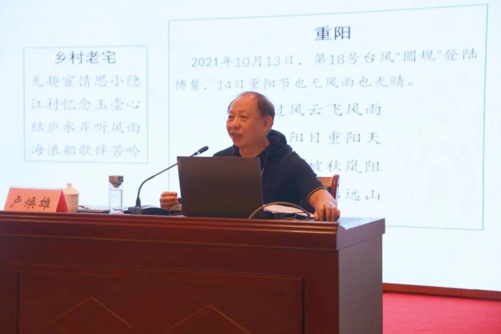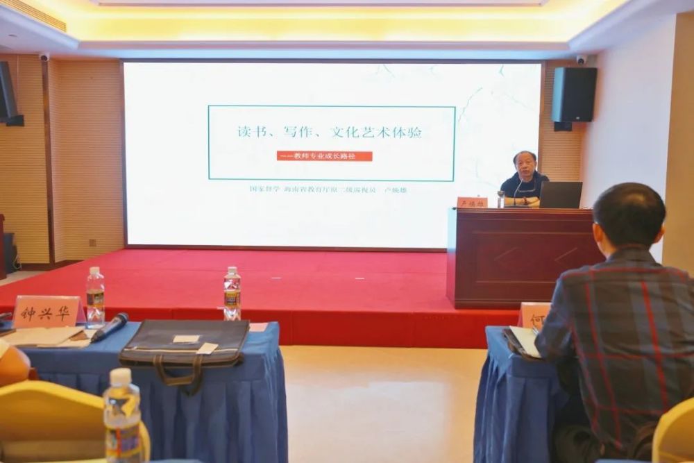 卢焕雄厅长结合自身思考与经验,为我们带来《读书、写作、文化艺术体验——教师专业成长路径》的精彩讲座。卢焕雄厅长强调读书应是快乐的,教师应根据职业阶段选择读书类型,且需讲究读书方法。读写结合,勤耕笔辍,教师读书之余,可多创作诗歌散文,或是写作论文。此外,好的教师还应是得道之人,高雅之士。琴棋书画,诗酒花茶,样样皆通。教师应通过多重艺术体验促进专业提升,用文化涵养身心,用艺术铸就人生。卢焕雄厅长的讲座旁征博引,引经据典,语言幽默风趣,内容真挚深刻,令人醍醐灌顶,与会教师无不热烈鼓掌。