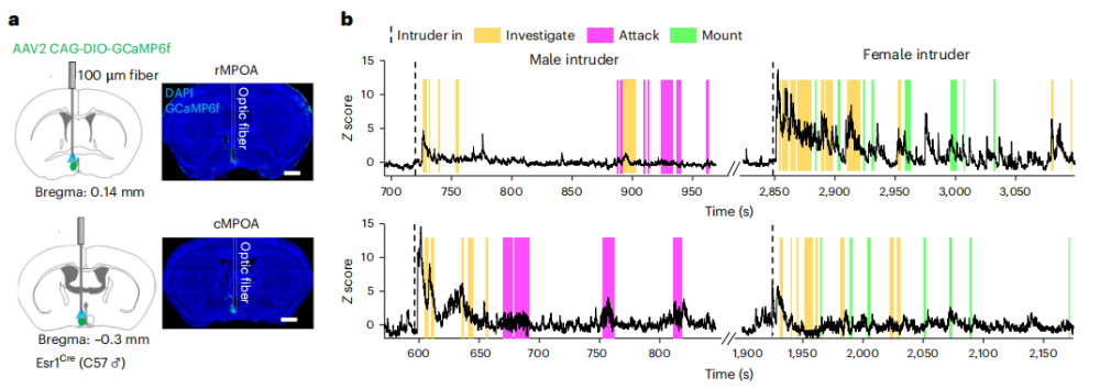 MPOA-Esr1神经元可进一步分为吻侧(rMPOA-Esr1)和尾侧(cMPOA-Esr1),光纤钙成像技术记录发现在面对雌性小鼠闯入时或者对雌性小鼠进行嗅探,rMPOA-Esr1神经元激活更为活跃,cMPOA-Esr1神经元活性变化不存在这种性别差异性。在与雄性小鼠的攻击行为中cMPOA-Esr1神经元活性变化更为活跃。