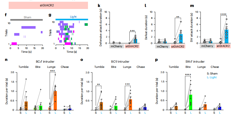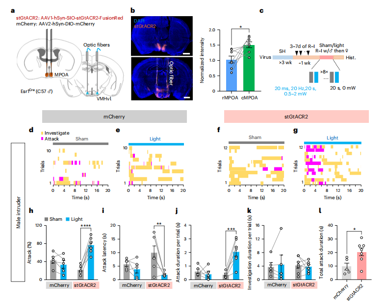 在小鼠形成稳定的攻击行为,通过光遗传学技术激活cMPOA Esr1–VMHvl环路后可明显缩短暂停攻击行为的时间,减少持续攻击的时间。在另外一种先天性攻击性很强的SW品系小鼠中,激活上述神经环路也能明显降低攻击行为。