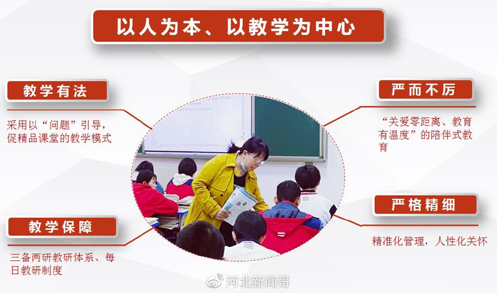 引进名校“以人为本、以教学为中心”的科学管理,采用“精品课堂”模式和“三备两研”教学保障体系,培养“自律、自信、自强”新时代优秀学生,实现“低进高出、高进优出、大面积丰收”的教学成果。