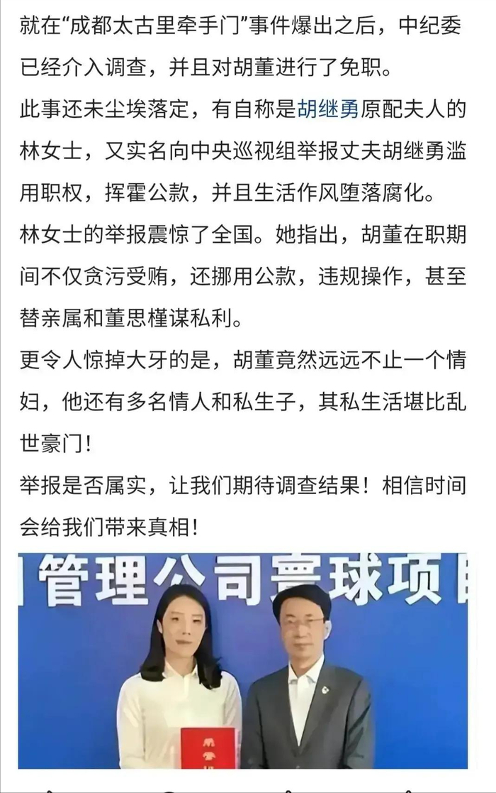 前两天网上冒出来疑似胡总的声明,今天又冒出来疑似胡总的媳妇跑去检举胡总的消息。