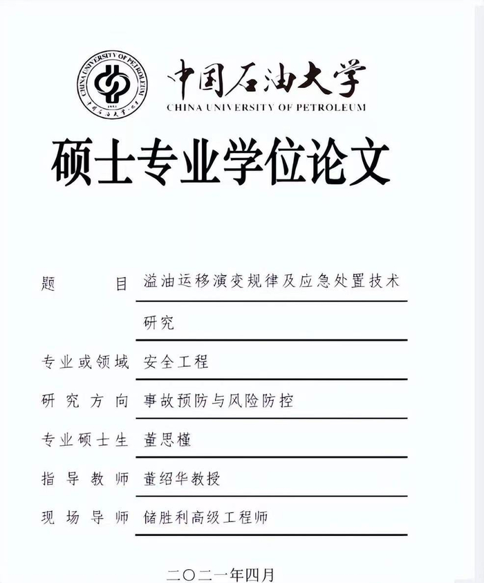 研究生论文写的主题是“溢油运移演变规律及应急处置技术”。