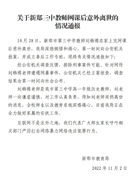 近日,河南省新郑市第三中学一名刘姓历史老师上网课后在家中不幸去世。