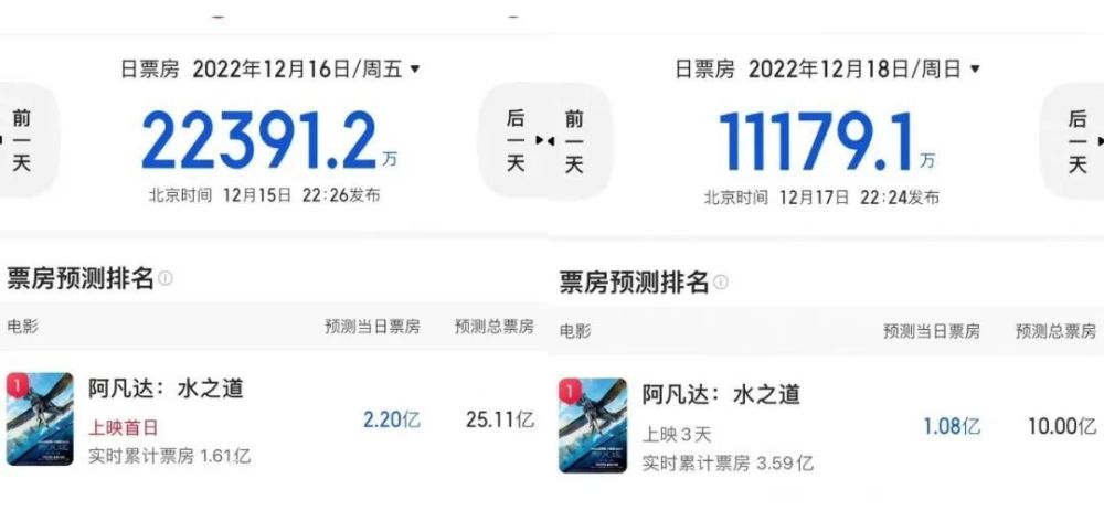 《阿凡达2》的映前票房预测成绩为22亿-33亿,而截止目前《阿凡达2》上映第4天,票房刚刚超过4亿。对比今年上映的《万里归途》,上映4日票房达到了5.19亿,而《万里归途》的票房最终没有超过15亿。
