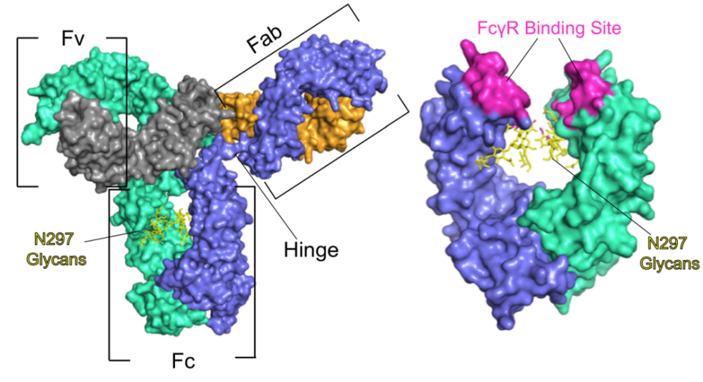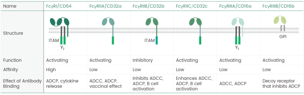 人体内有两类IgG的Fc受体(FcγR),一类为激活受体,包含 FcγRI (CD64)、FcγRIIA (CD32a)、FcγRIIC(CD32c)、FcγRIIIA (CD16a)和FcγRIIIB (CD16b);一类为抑制受体,FcγRIIB (CD32b)是唯一发现的Fc抑制受体。