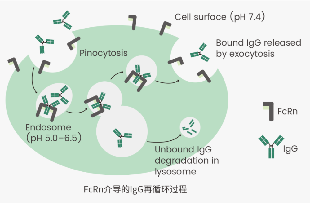 2. 开发结合抗原pH依赖的抗体。TMDD(靶点介导的药物处置模型)消除快,半衰期短,导致血浆/血清抗体浓度低。开发pH敏感抗体成为克服TMDD消除快的可能。在这个模型下,抗体与抗原结合后内化至细胞的核内体中,pH6的酸性环境下抗体与抗原解离,抗体被FcRn转运回血浆,抗原则被细胞降解。