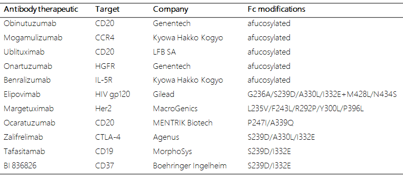 1. 改造抗体Fc尾序列,提高抗体与FcγRs的亲和力。如抗体Fc尾改造Gly236Ala、 Ser239Asp、Ala330Leu和Ile332Glu (GASDALIE),可以将抗体与FcγRIIIA的亲和力提高20倍,而对抗体与FcγRIIB的亲和力影响极小。