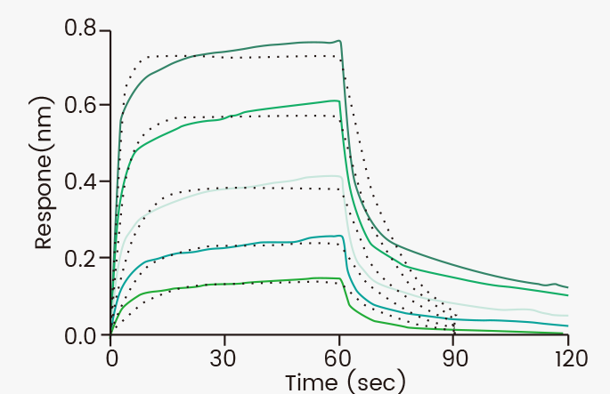 Loaded Human FcγRIIIA / CD16a (V176) recombinant protein (Cat. 10389-H08H1) on His1K Biosensor, can bind Bevacizumab (IgG1) with an affinity constant of 0.83 μM as determined in a BLI assay (ForteBio Octet Red384).