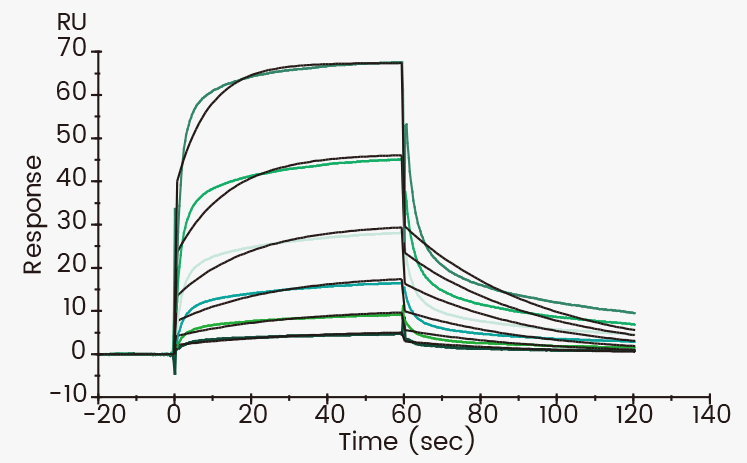 Captured Human FcγRIIIA / CD16a (V176) recombinant protein (Cat. 10389-H08H1) on Anti-His Chip can bind Bevacizumab (IgG1) with an affinity constant of 0.31 μM as determined in an SPR assay (Biacore T200).