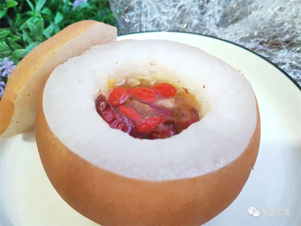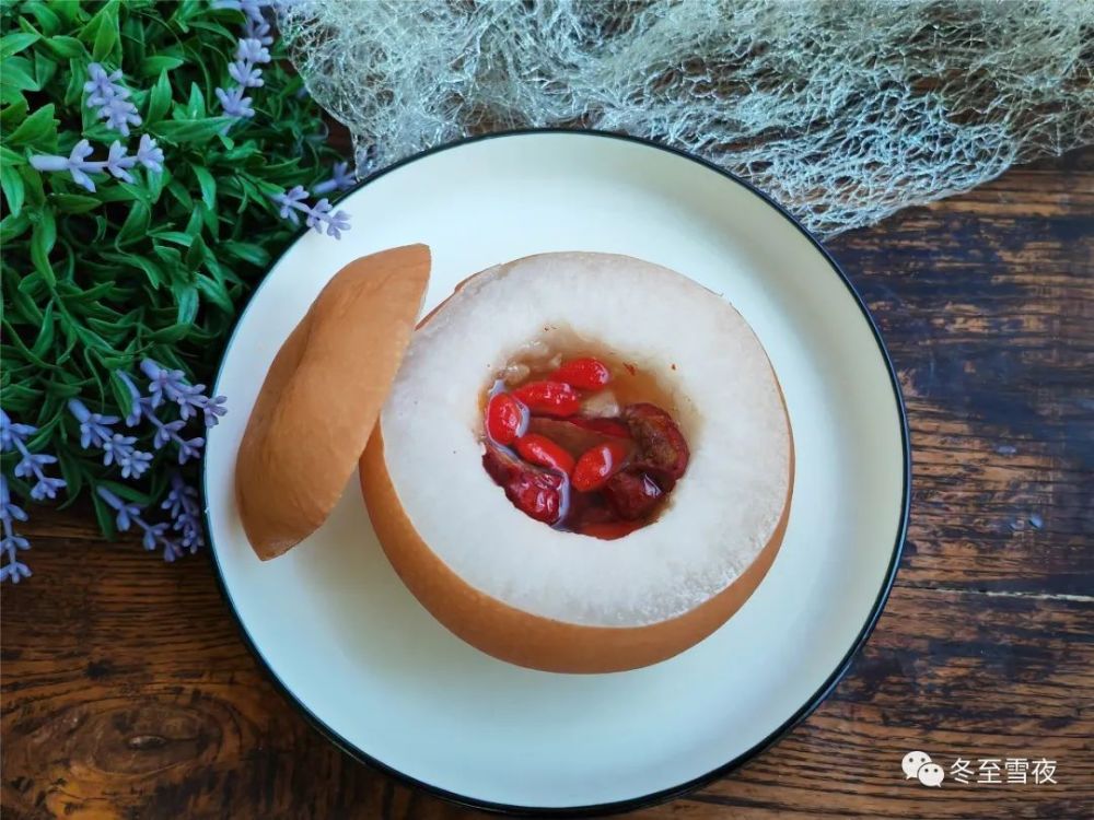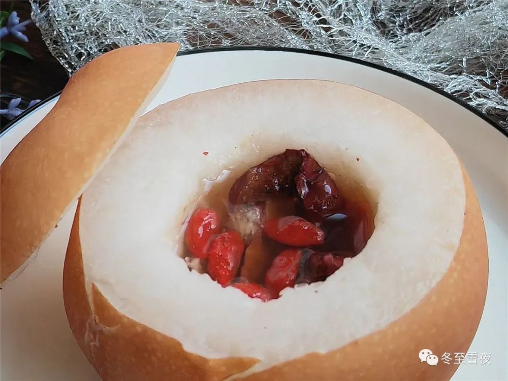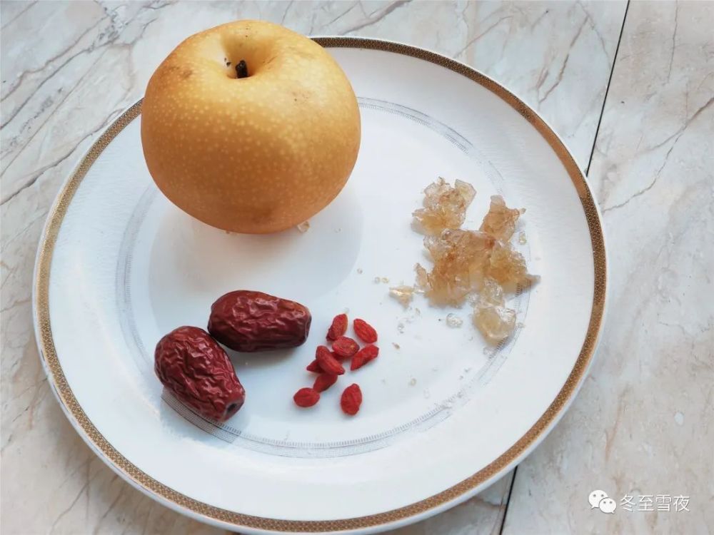 【冰糖雪梨】所需材料:梨1个、白冰糖或者黄冰糖4-5粒、大枣2个、枸杞7-8粒、