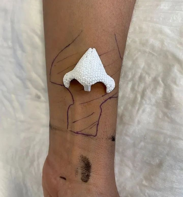 然后,这副“骨架”被植入到卡琳的小臂中,科学家还从患者的太阳穴区域取下一块皮瓣,覆盖在鼻子“骨架”外面。皮瓣(skin flap)是由皮肤和皮下组织共同构成的,移植时还保留着血液循环——长出新鼻子就靠它了。