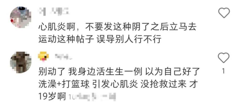 但网友们大多认为,转阴后不要马上开始运动,会诱发心肌炎,很多人现身说法,自己身边就确实有发生类似惨剧