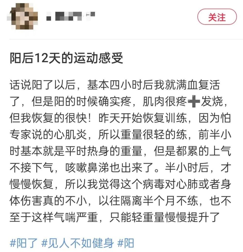 其实,阳过没多久就恢复锻炼的例子不在少数,有些人除了身体机能确有下降,整体运动完的反馈也都还蛮不错。