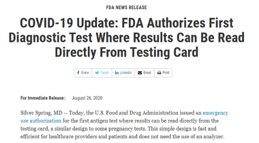 近日,美国食品药品监督管理局(FDA)将针对抗原检测的紧急使用授权发布给雅培的BinaxNOW COVID-19 Ag卡。该产品是一种快速、可靠、高度便携且价格低廉的新冠检测工具,可用于大规模检测冠状病毒感染。这类检测技术可以从卡条上直接读取结果,类似于家庭妊娠测试。雅培称,该产品“使用成熟的侧向流技术,在不需要仪器的情况下,只需15分钟即可获得结果,临床研究显示其灵敏度为97.1%,特异度为98.5%”。