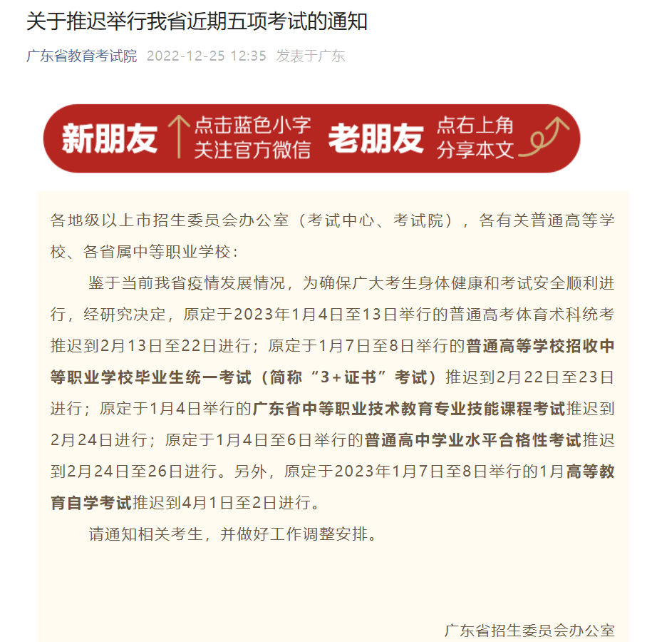 据“广东省教育考试院”微信公众号消息,鉴于当前广东省疫情发展情况,为确保广大考生身体健康和考试安全顺利进行,经研究决定,原定于2023年1月4日至13日举行的普通高考体育术科统考推迟到2月13日至22日进行;原定于1月7日至8日举行的普通高等学校招收中等职业学校毕业生统一考试推迟到2月22日至23日进行;原定于1月4日举行的广东省中等职业技术教育专业技能课程考试推迟到2月24日进行;原定于1月4日至6日举行的普通高中学业水平合格性考试推迟到2月24日至26日进行。另外,原定于2023年1月7日至8日举行的1月高等教育自学考试推迟到4月1日至2日进行。