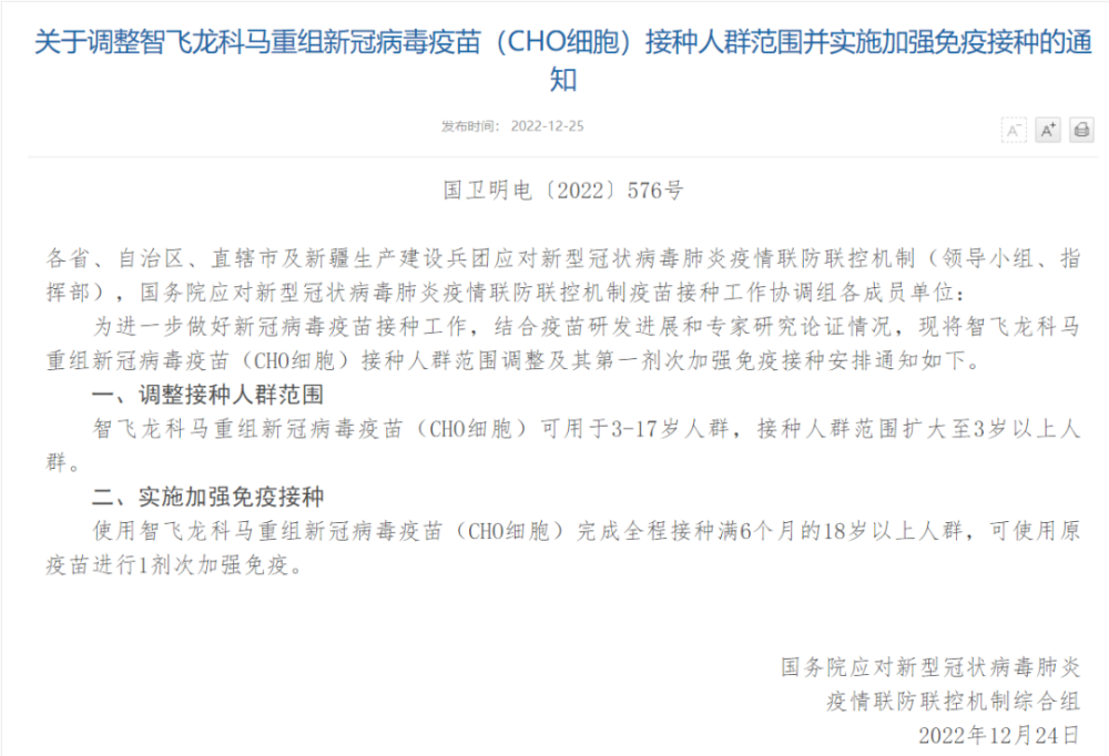 国务院联防联控机制综合组发布关于调整智飞龙科马重组新冠病毒疫苗(CHO细胞)接种人群范围并实施加强免疫接种的通知,为进一步做好新冠病毒疫苗接种工作,结合疫苗研发进展和专家研究论证情况,现将智飞龙科马重组新冠病毒疫苗(CHO细胞)接种人群范围调整及其第一剂次加强免疫接种安排通知如下:一、调整接种人群范围。智飞龙科马重组新冠病毒疫苗(CHO细胞)可用于3-17岁人群,接种人群范围扩大至3岁以上人群。二、实施加强免疫接种。使用智飞龙科马重组新冠病毒疫苗(CHO细胞)完成全程接种满6个月的18岁以上人群,可使用原疫苗进行1剂次加强免疫。