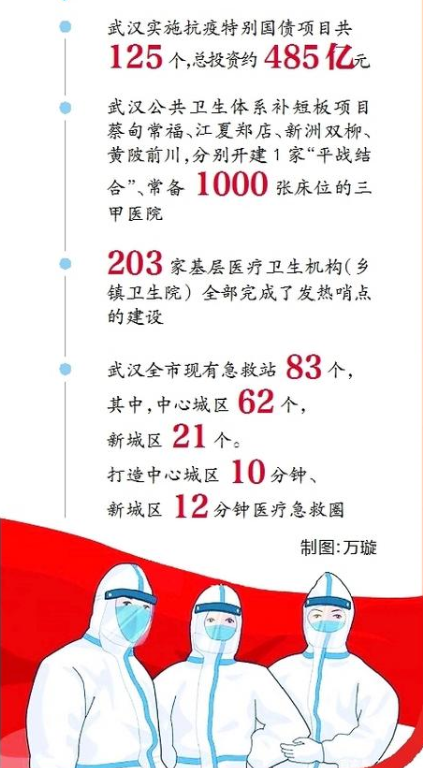为打好公共卫生“安全补丁”,一年间,湖北全省开工建设公共卫生体系补短板项目1142个,规划总投资1381亿元。在武汉,62家定点医院发热门诊在疫后完成标准化建设,4家平战结合医院建设正如火如荼,都将于今年7月交付。