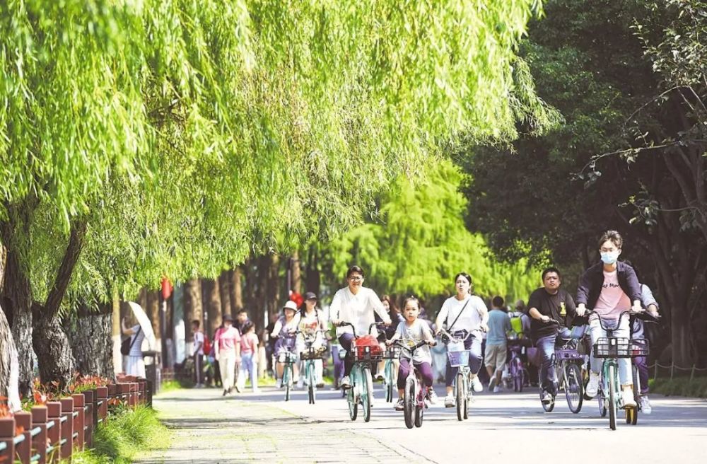 2020年10月1日,市民和游客在东湖绿道骑行,享受惬意的假期生活。(湖北日报全媒记者 李溪 摄)