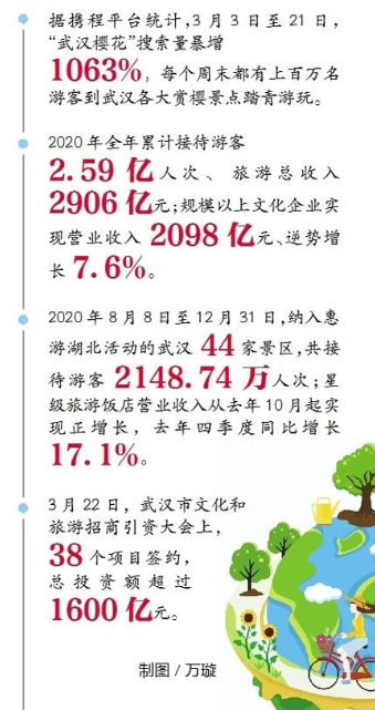 去年8月,“惠游湖北·打卡大武汉”系列活动,让武汉旅游市场迅速“沸腾”。2020年全年累计接待游客2.59亿人次、旅游总收入2906亿元;规模以上文化企业实现营业收入2098亿元、逆势增长7.6%。其中,2020年8月8日至12月31日,纳入惠游湖北活动的武汉44家景区,共接待游客2148.74万人次,黄鹤楼景区人气指数位列全国第一;星级旅游饭店营业收入从去年10月起实现正增长,去年四季度同比增长17.1%。