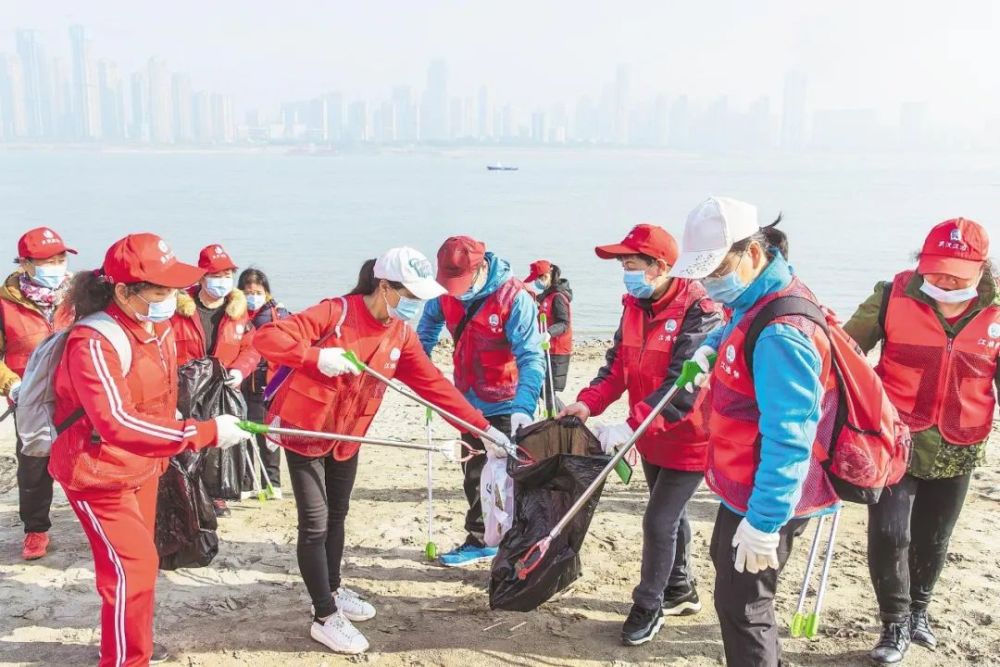 2月2日下午,武汉市江滩办在汉口江滩沿江滩地开展的“我爱母亲河 清洁滩地我们在行动”活动中,志愿者在捡拾垃圾,清洁滩地。(湖北日报全媒记者 梅涛 通讯员 向丽华 摄)