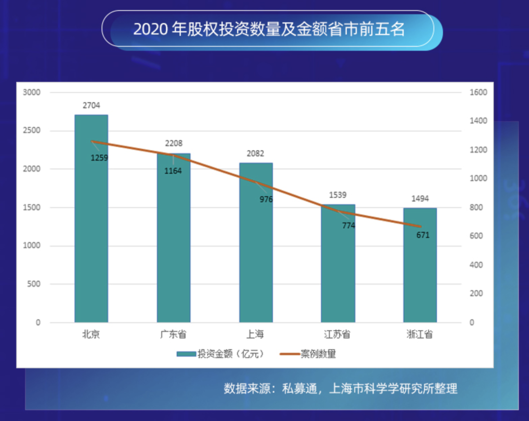 2020全年,上海股权融资规模与数量均位列全国第3,大大缩小了与北京、广东的差距。
