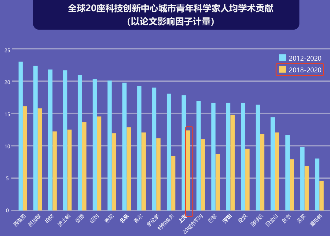 统计全球青年科学家论文发现,2018-2020年,上海青年科学家人均学术贡献排名20城市中的第8位,上海青年科学家成长速度排名全球第6位。