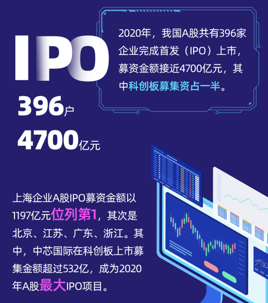 2020年A股最大IPO项目是谁?答案是中芯国际,其在科创板上市募集金额超过532亿。科创板给科技企业打了一针强心剂,2020年上海企业A股IPO募资金额全国第1,全年我国A股共有396家企业完成IPO上市,募集金额接近4700亿元,其中科创板募集资金占一半。