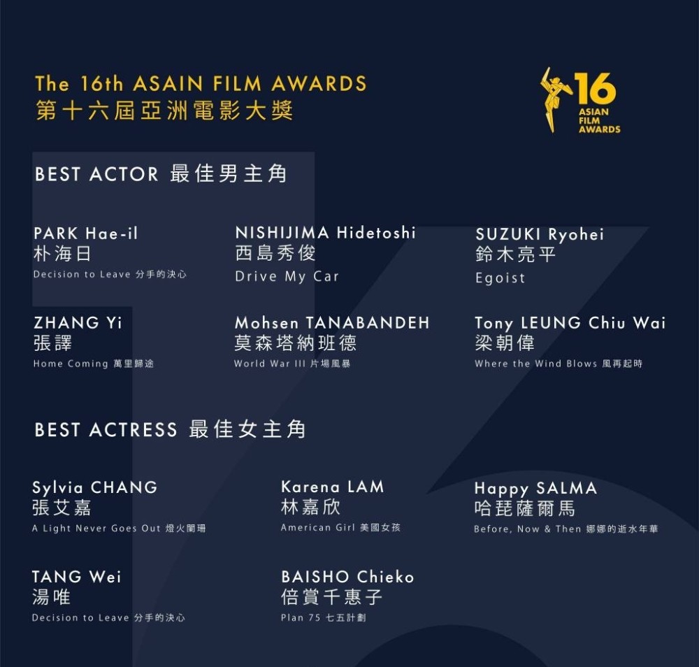 第16届亚洲电影大奖将于3月12日在中国香港举行颁奖礼,张艺谋担任评委会主席。《人生大事》和《万里归途》是来自中国内地的电影,其实还有来自中国香港、中国台湾的电影主创,入围了本届亚洲电影节。