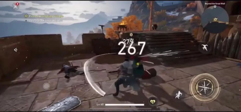 这段2分多钟的实机画面内容不多,但确实有浓浓的”刺客信条味“。根据此前公开的设定,该作的历史背景是公元前215年的中国古代秦朝,与其相符的是,演示中一开始的地点是在长城,视频中字幕提到也是秦朝士兵,而左上角的任务提示则是“保护永宁村”。