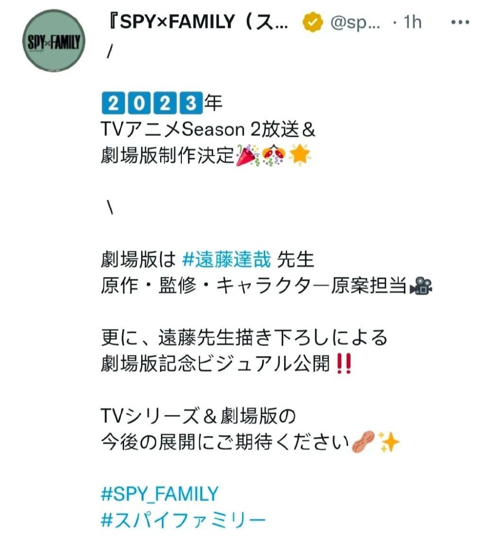 今日,动画《间谍过家家》第一季Part2放送完毕,制作组趁热打铁,放出了动画第二季以及剧场版制作的消息。