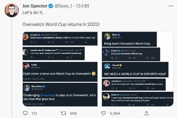 官方将在明年一月宣布参加2023年《守望先锋世界杯》的36个国家/地区,36支《守望先锋世界杯》入选队伍将通过区域性的线上比赛决出16强。这16支队伍将在2023年秋季在线下局域网环境中进行争夺,以决出自2019年以来的第一个世界杯冠军。此外,官方正在积极制定计划,希望将一支中国队伍纳入本届赛事。