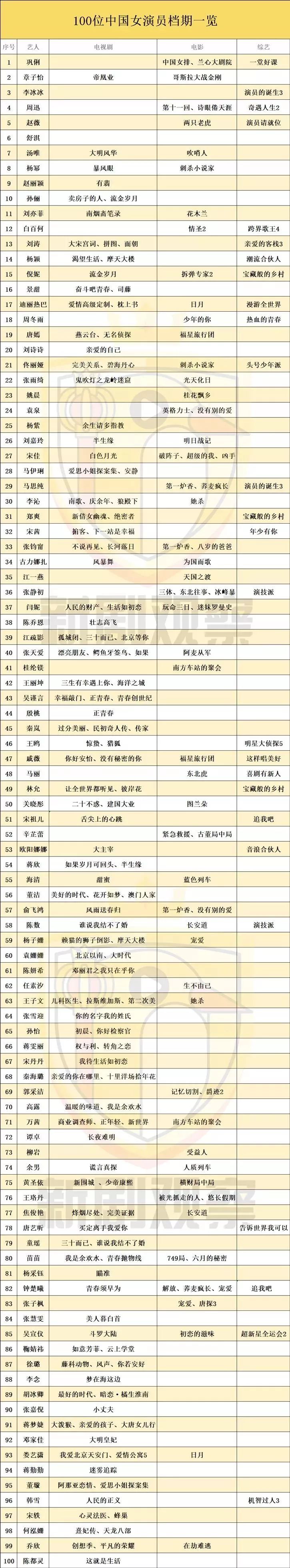 中国100位当红女演员档期一览,“腰部”女演员接戏较多