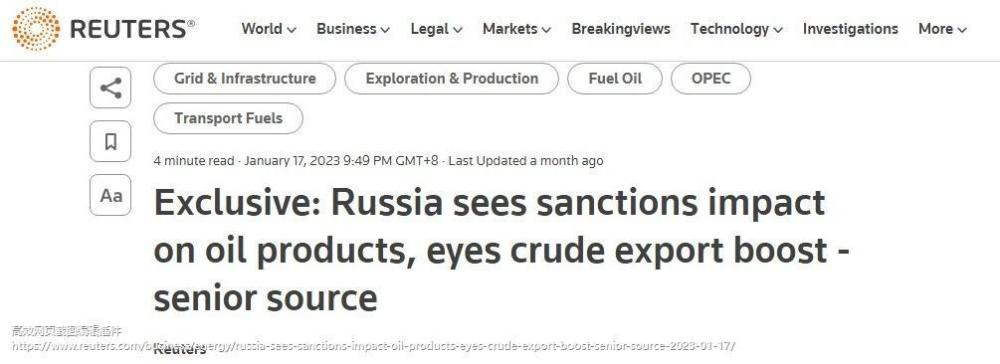 2月18日的路透社在一篇题为《独家:俄罗斯认为制裁对石油产品销售有影响,将着眼于提振原油出口》的新闻中披露,2022年11月份,俄罗斯获悉欧盟正在制定对俄罗斯包括柴油在内的石油产品实施禁运和限价的消息之后,即与印度联系俄罗斯柴油买卖事宜,但多次遭到印度的拒绝。路透社援引行业消息人士和印度炼油厂代表的话说,印度炼油厂不可能购买俄罗斯的柴油。俄罗斯炼油厂的代表则表示,印度虽然购买了越来越多的俄罗斯原油,但它不会将俄罗斯石油工业从欧洲的柴油禁运中拯救出来。