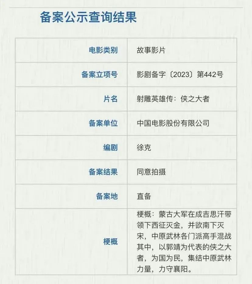 就在影迷感慨年过七十的徐老怪是不是要放慢脚步之际,新版《射雕英雄传》电影发布备案消息,该片即将在年内开拍,徐克担任导演和编剧。