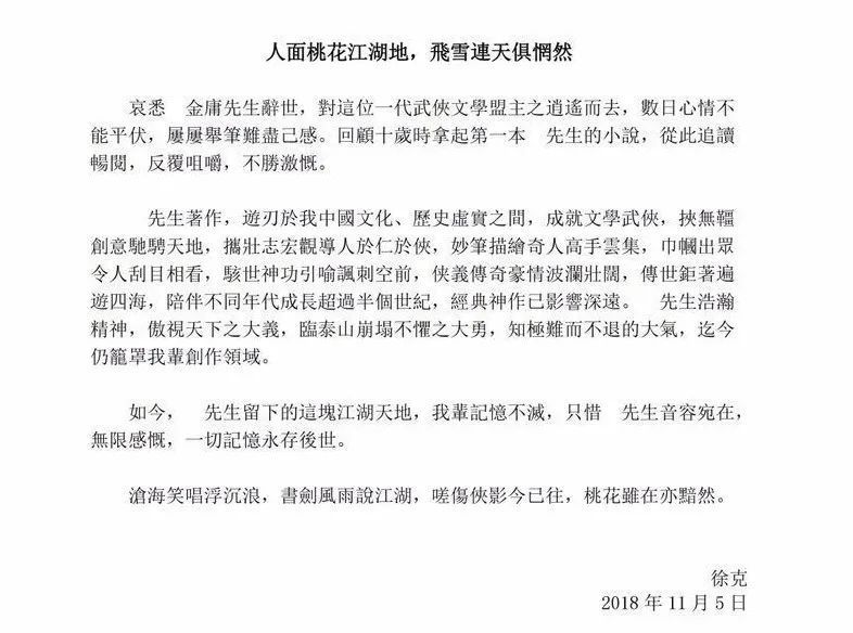 徐克当年发文缅怀金庸